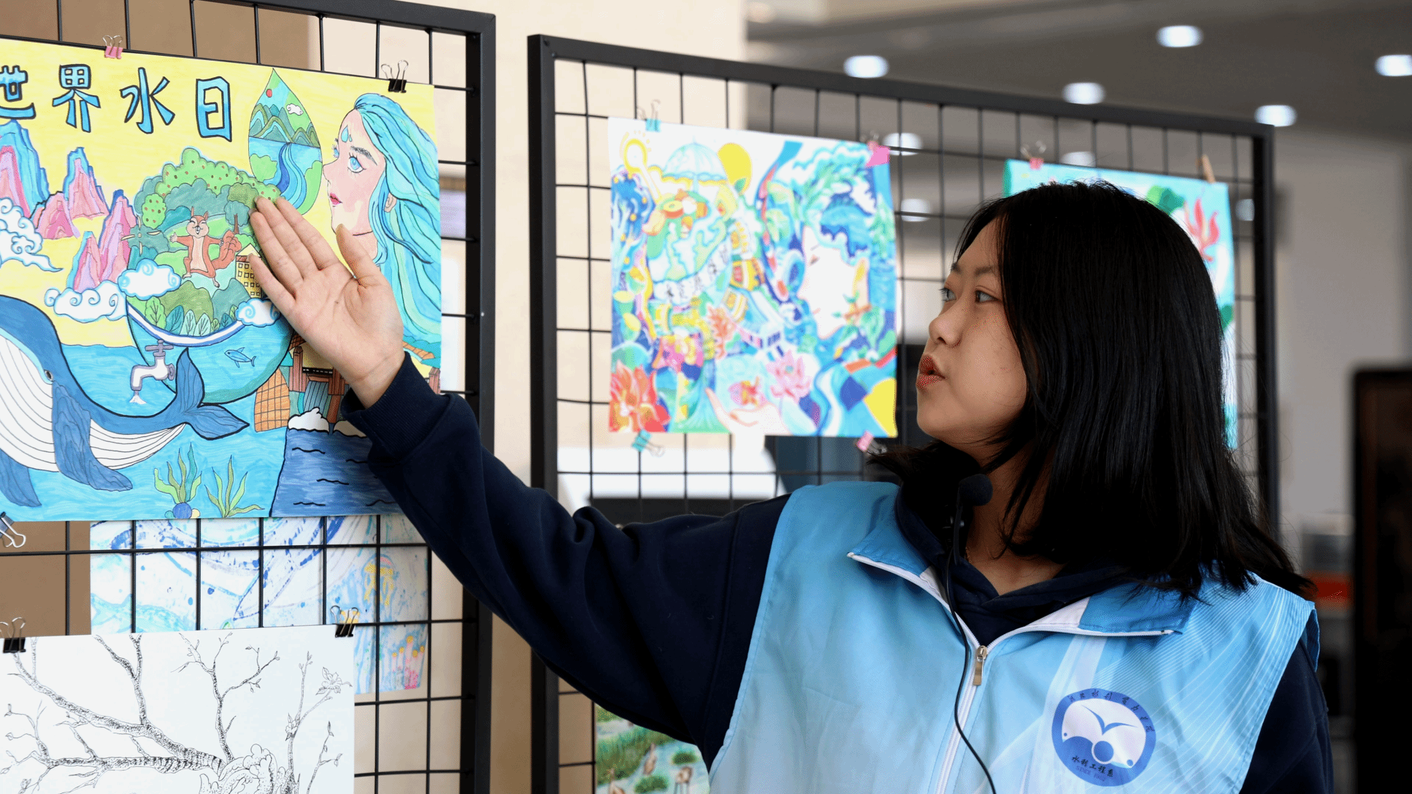 在绘画展览区,陈列了来自两校学生的50余幅精美作品。上海路小学的学生刘承翰、姚沛岑、杨程乔以童真的视角,用画笔描绘出了对蓝色碳汇与滨海生态的美好愿景。水利工程系的学生房明玥、王浩杨则结合所学专业知识,从节约水资源、保护水生态、共筑水安全等角度入手,分享了他们的创作理念,展现了青年一代对滨海生态保护的深刻思考和感悟。
