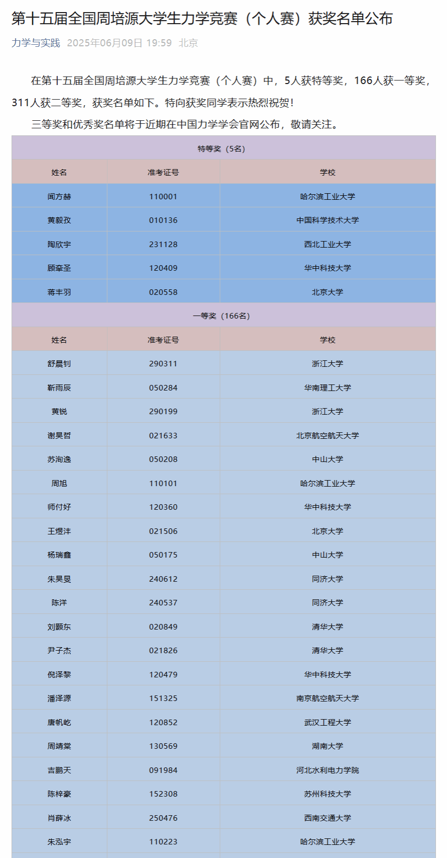 近日,第十五届全国周培源大学生力学竞赛结果正式揭晓。华亿手机版学子表现卓越,首次摘得全国一等奖桂冠,取得历史性突破,彰显了学校基础力学教学的扎实功底,呈现了华亿手机版学生创新实践教育的硕果。