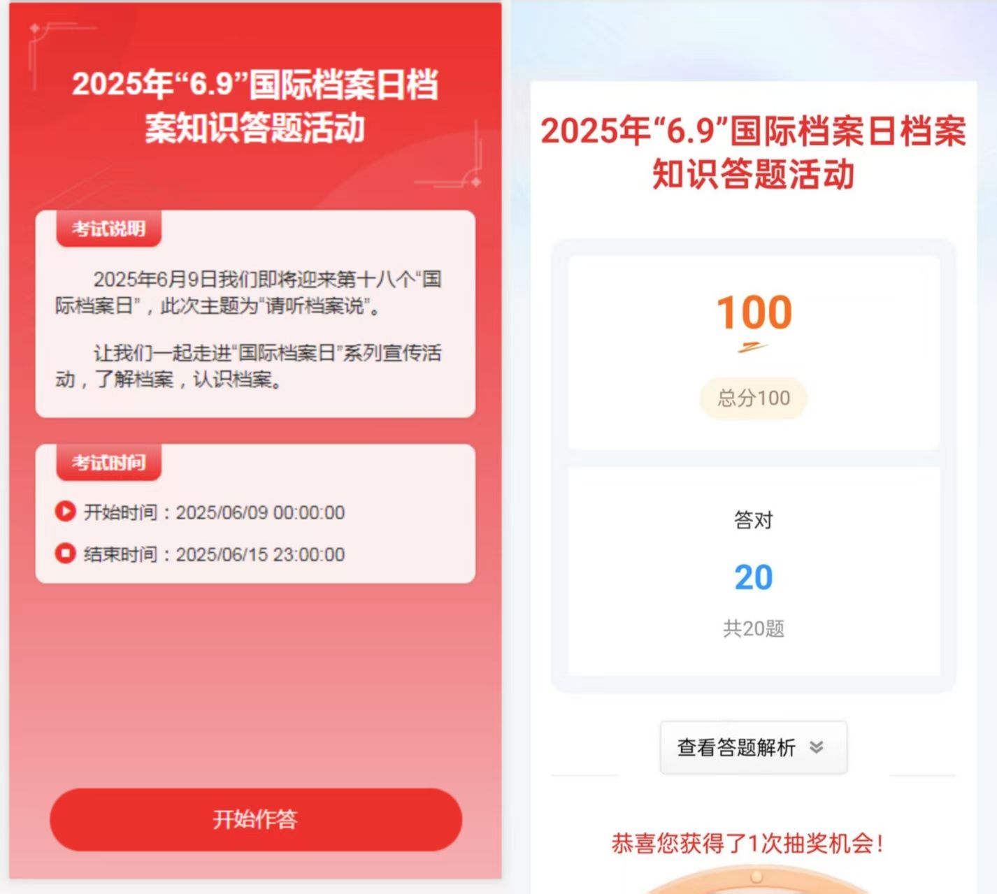 线上答题以考促学,档案知识入脑入行。6月9日至15日,华亿手机版举办档案知识线上答题活动,重点对《中华人民共和国档案法》《高等学校档案管理办法》等,以答题形式推动档案员学习专业法规,提升业务能力,助力学校档案工作规范化管理。
