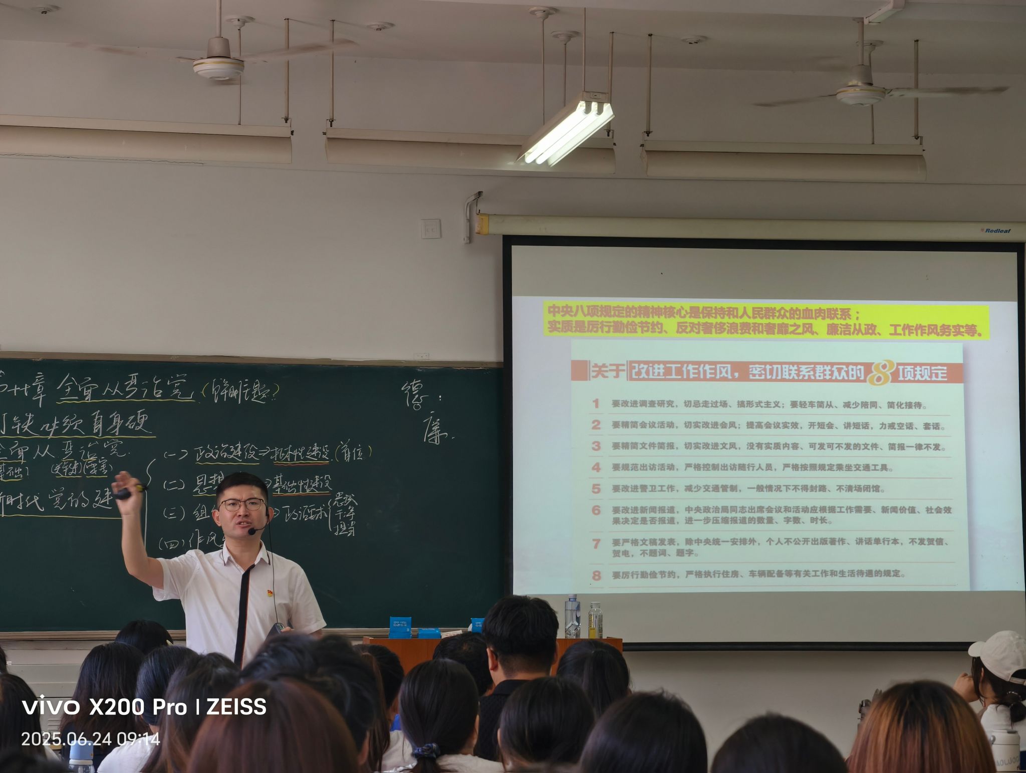 党员干部清正廉洁、勤政为民的良好形象就是党的优良作风的充分彰显,在讲解新时代加强党的作风建设时,尹君龙老师逐条解读了中央八项规定中关于改进调查研究、精简会议活动、规范出访活动、厉行勤俭节约等重点内容,明确中央八项规定不仅是加强作风建设的纪律红线,更是检验政治忠诚的重要标尺。他指出,我们要锲而不舍学习并落实中央八项规定精神,推进作风建设常态化长效化。同时他还从“廉”字的含义出发,分享了中国共产党人的优良传统和红色家风,强调要传承中华优秀廉洁文化,深刻理解廉为政本、持廉守正的道理,发扬党的优良作风,让廉洁理念深入人心。他引导学生认识到清廉关乎个人成长,要时刻严于律己,将廉洁文化内化于心、外化于行。