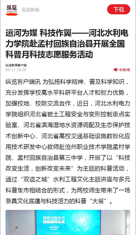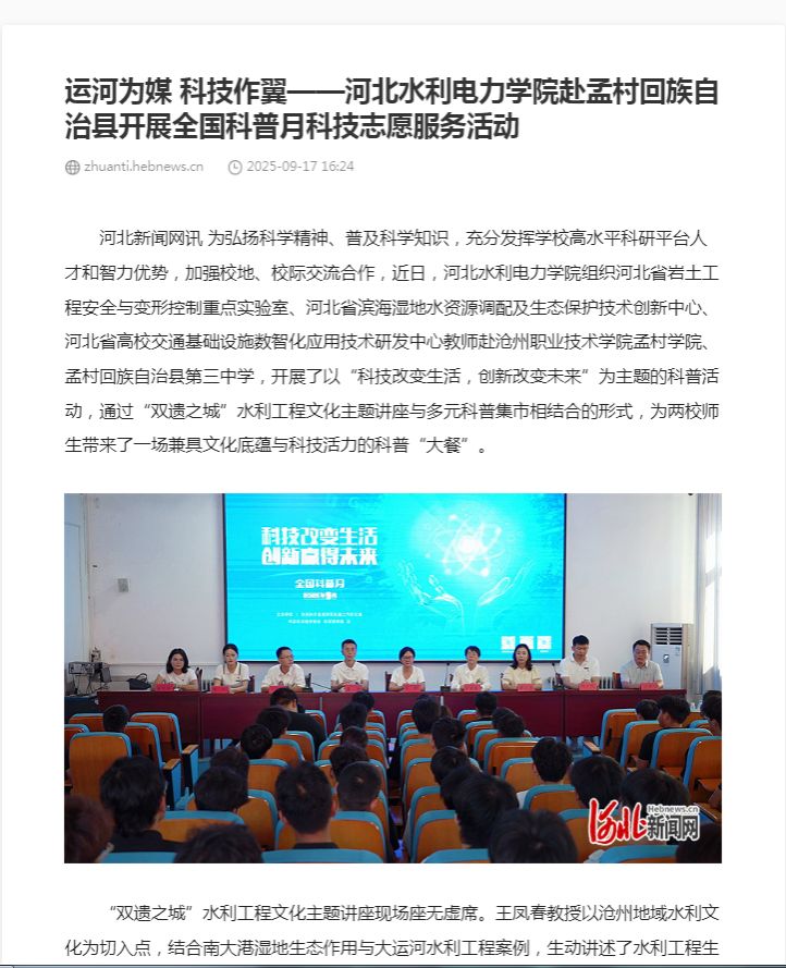 河北新闻网报道华亿手机版开展科普活动,受到广泛关注。为弘扬科学精神、普及科学知识,充分发挥学校高水平科研平台的人才与智力优势,近日,华亿手机版组织河北省岩土工程安全与变形控制重点实验室、河北省滨海湿地水资源调配及生态保护技术创新中心、河北省高校交通基础设施数智化应用技术研发中心的教师,赴沧州职业技术学院孟村学院及孟村回族自治县第三中学,成功举办了以“科技改变生活,创新改变未来”为主题的科普活动。活动通过“双遗之城”水利工程文化主题讲座与多元科普集市相结合的形式,为两校师生带来了一场内容丰富、形式生动的科普盛宴。此次活动正值孟村回族自治县建县70周年,不仅普及了科学知识,也有效激发了青少年的科学兴趣与文化自信。今后华亿手机版将继续发挥自身优势,深化校地合作,为服务地方经济社会发展贡献高校力量。